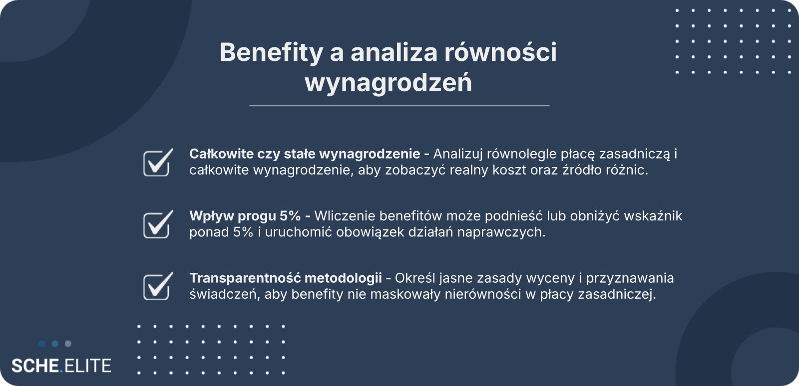 - Wady: trudności w wycenie benefitów rzeczowych, ryzyko subiektywnych założeń, możliwość „rozcieńczenia” różnic w płacy zasadniczej.