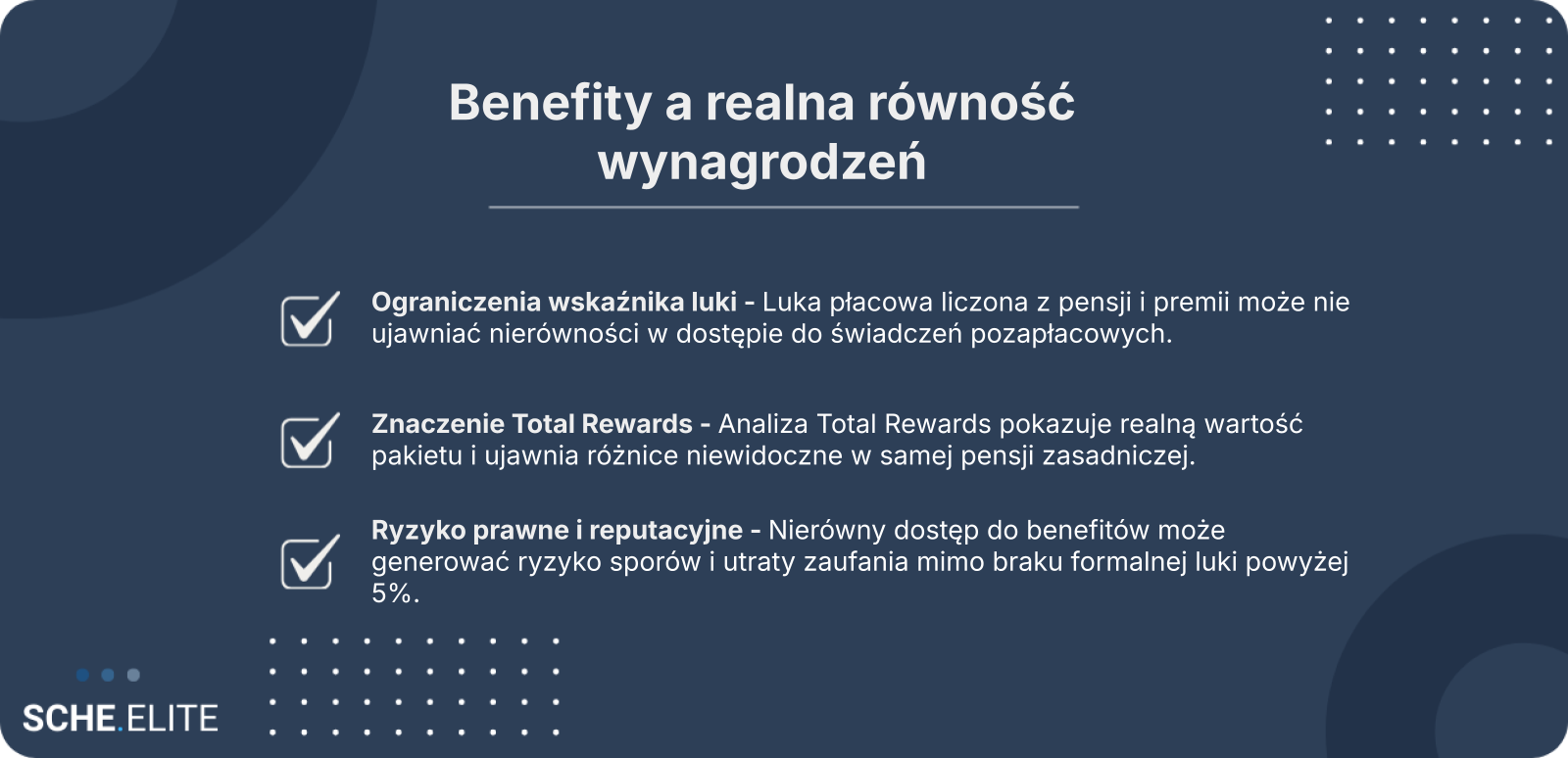 Problem pojawia się wtedy, gdy najbardziej atrakcyjne świadczenia trafiają głównie do określonej grupy, na przykład do mężczyzn zajmujących wyższe stanowiska kierownicze. W takiej sytuacji nawet przy braku różnic w wynagrodzeniu zasadniczym może występować realna nierówność ekonomiczna. Analiza ograniczona do pensji nie wykaże jej, ale pracownicy mogą ją odczuwać bardzo wyraźnie.