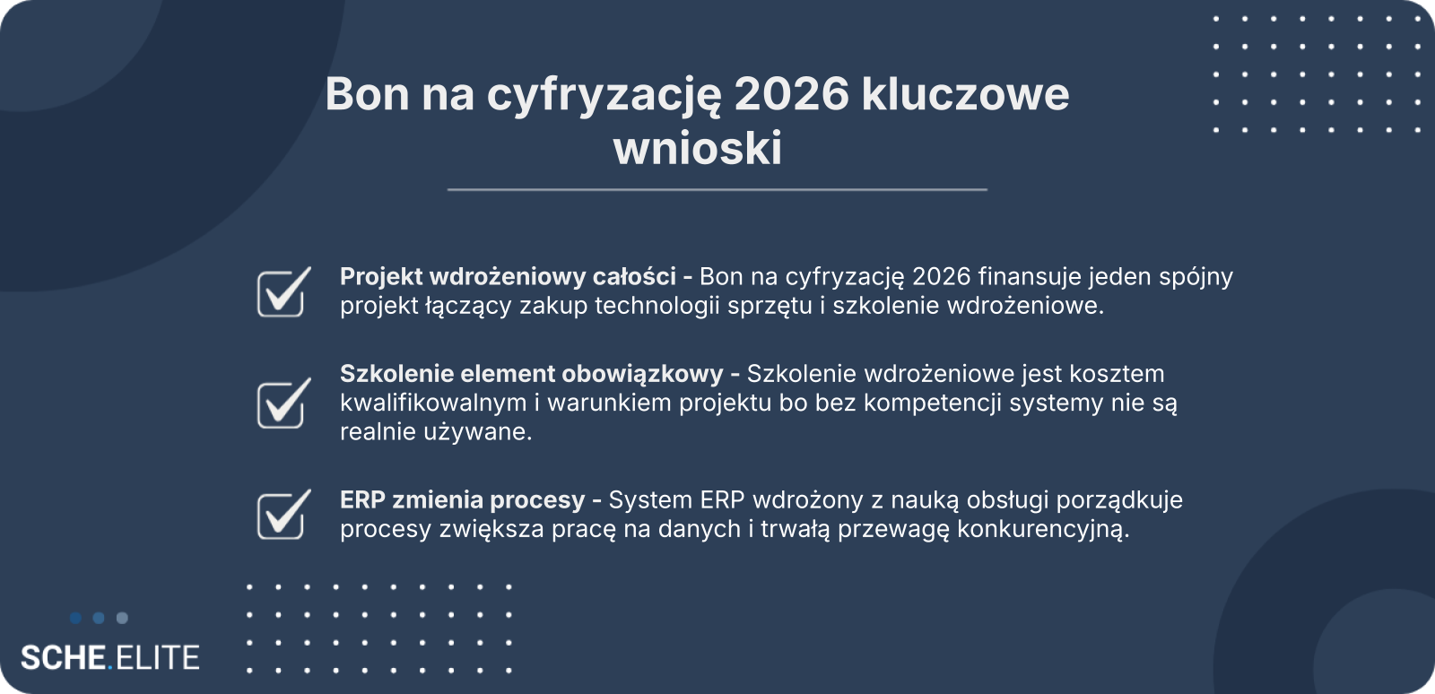 W praktyce oznacza to odejście od myślenia o oprogramowaniu i kompetencjach jako o dwóch oddzielnych wydatkach. W bonach cyfryzacyjnych zakup technologii, takiej jak system ERP, oraz szkolenie wdrożeniowe są nierozerwalnie powiązane. Szkolenie nie pełni funkcji dodatku, lecz stanowi obowiązkowy element projektu, który ma zapewnić realne wykorzystanie wdrażanych rozwiązań. Zrozumienie tej logiki jest kluczowe dla prawidłowego zaplanowania zakresu projektu i oceny jego efektywności.