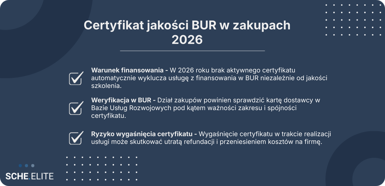 W praktyce oznacza to nowe ryzyka operacyjne i finansowe. Nawet dobrze zrealizowane szkolenie może zostać zakwestionowane na etapie rozliczenia, jeśli dostawca nie spełnia aktualnie certyfikat jakości BUR wymagania. Działy zakupów muszą więc patrzeć szerzej: nie tylko na ofertę i cenę, ale na ciągłość spełnienia warunków w całym cyklu usługi.