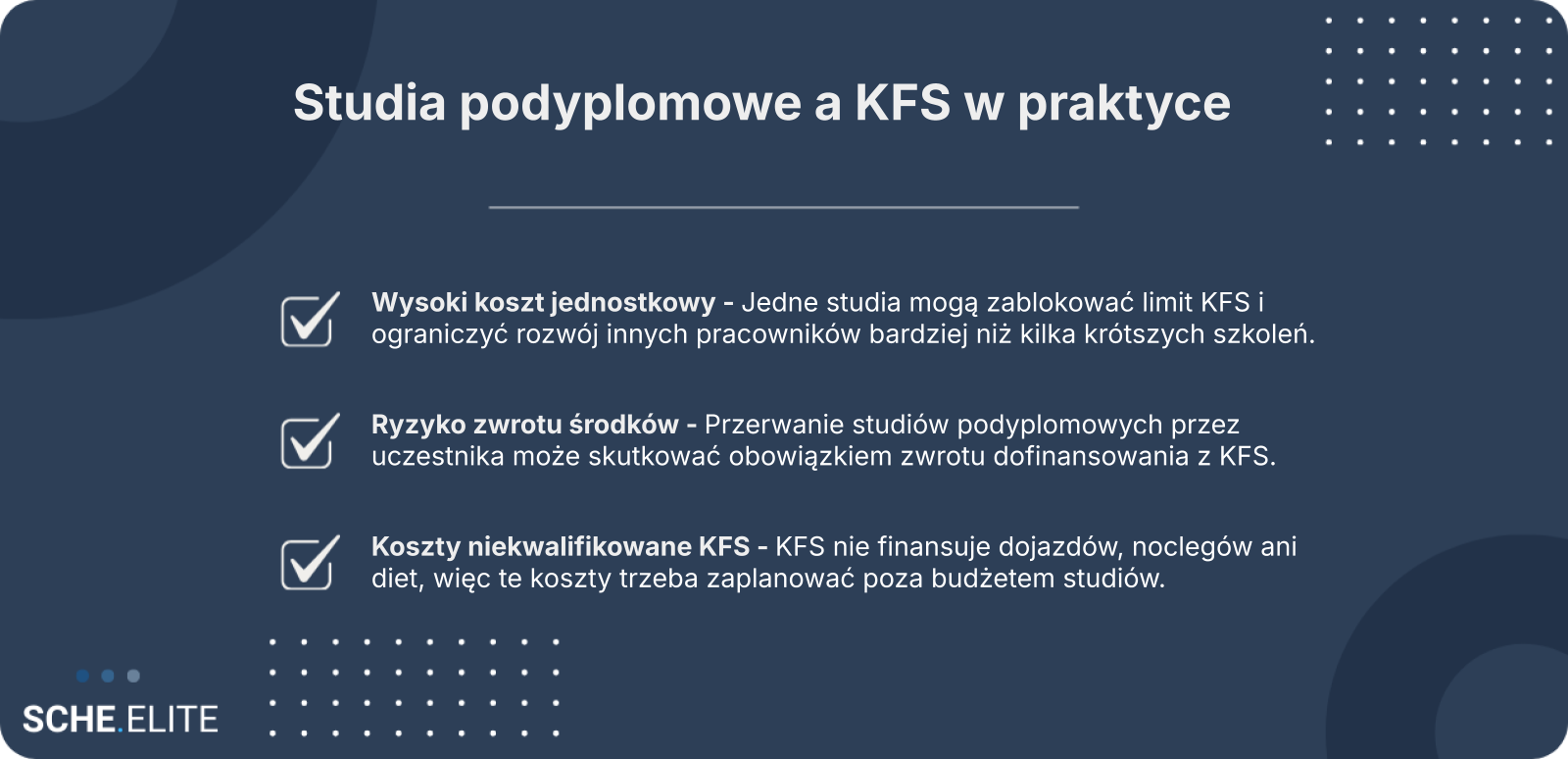 Tabela: Limity finansowania KFS na uczestnika i ich konsekwencjeScenariuszSkutek dla budżetu Wysoki koszt studiów podyplomowych z KFS ma konsekwencje wykraczające poza jednego uczestnika. Dla działów HR i zarządów oznacza to konieczność przesunięć w planach rozwojowych, często kosztem szkoleń operacyjnych czy kompetencji miękkich. Budżet KFS jest zazwyczaj tylko jednym z elementów całego systemu finansowania rozwoju, jednak jego ograniczenia są szczególnie dotkliwe. Gdy znacząca część środków zostanie przeznaczona na jedną formę kształcenia, organizacja traci elastyczność reagowania na nieprzewidziane potrzeby kompetencyjne w ciągu roku. Dlatego przy studiach podyplomowych kluczowe staje się myślenie systemowe. Nie chodzi wyłącznie o to, czy dane studia są wartościowe merytorycznie, lecz o to, jak ich finansowanie wpływa na cały portfel inwestycji szkoleniowych. W wielu przypadkach to właśnie ten szeroki kontekst przesądza o tym, że firmy rezygnują z długich form kształcenia na rzecz bardziej rozproszonych działań. Decyzja o sięgnięciu po dofinansowanie studia podyplomowe KFS bywa podejmowana pod presją czasu i dostępności środków. W praktyce ryzyka pojawiają się nie w momencie podpisania umowy, lecz w trakcie realizacji długiej formy kształcenia. Im dłuższy cykl, tym większa ekspozycja na zmiany organizacyjne, kadrowe i osobiste uczestnika. To odróżnia studia podyplomowe z KFS od krótkich szkoleń, które domykają się w tygodniach, a nie w semestrach. Warto też pamiętać, że Krajowy Fundusz Szkoleniowy działa w reżimie środków publicznych. Oznacza to formalizm rozliczeń i niską tolerancję na odstępstwa od deklarowanego planu. Pracodawca, który nie uwzględni ryzyk na etapie wniosku, może ponosić konsekwencje finansowe niezależnie od dobrej woli czy uzasadnionych przyczyn zmian. Przerwanie studiów przez jednego uczestnika może skutkować koniecznością zwrotu znacznej części środków KFS. Najczęściej pomijanym zagrożeniem jest odpowiedzialność za ciągłość udziału pracownika w studiach. Dofinansowanie studia podyplomowe KFS jest przyznawane na konkretną osobę i określony program. Jeżeli uczestnik przerwie naukę z powodów zawodowych lub osobistych, urząd pracy może zakwestionować zasadność poniesionego wydatku. W skrajnych przypadkach oznacza to obowiązek zwrotu środków, nawet gdy część zajęć została zrealizowana. Ryzyko to rośnie wraz z czasem trwania studiów. Zmiana stanowiska, restrukturyzacja, długotrwała absencja czy odejście pracownika z firmy są zdarzeniami trudnymi do przewidzenia na kilkanaście miesięcy naprzód. W krótszych formach kształcenia horyzont ryzyka jest znacznie mniejszy. W przypadku studiów podyplomowych z KFS pracodawca de facto kredytuje cały proces swoim bezpieczeństwem finansowym. Istotne jest również to, że interpretacje dotyczące proporcjonalności zwrotu nie zawsze są jednolite. Praktyka urzędów w latach niedawnych i bieżących potrafiła się różnić regionalnie, a brak precyzyjnych zapisów w umowie zwiększa niepewność. Dlatego ocena ryzyka powinna poprzedzać decyzję o złożeniu wniosku. Drugim ograniczeniem, które wpływa na realną opłacalność, są koszty niekwalifikowane. Krajowy Fundusz Szkoleniowy finansuje kształcenie, lecz nie pokrywa pełnego ekosystemu wydatków towarzyszących studiom podyplomowym. W długim horyzoncie te pozornie drugorzędne koszty mogą znacząco obciążyć budżet firmy albo samego pracownika. Do najczęściej wyłączonych z finansowania należą wydatki, których katalog bywa interpretowany ostrożnie przez instytucje publiczne: W przypadku studiów podyplomowych z KFS rozłożonych na wiele zjazdów te wydatki się kumulują. Co ważne, brak jednoznacznych przepisów powoduje, że część kosztów może być kwestionowana dopiero na etapie rozliczenia. To tworzy asymetrię ryzyka: decyzja zapada wcześniej, a pełna informacja o konsekwencjach finansowych pojawia się później. Analiza porównawcza pokazuje, że studia podyplomowe mają zarówno przewagi, jak i ograniczenia w kontekście finansowania publicznego. Zaletą jest spójny, akademicki program i formalny dyplom, który bywa istotny przy awansach lub wymaganiach regulacyjnych. Dla części ról to argument trudny do zastąpienia szkoleniami modułowymi. Jednocześnie długie formy kształcenia oznaczają zamrożenie znacznej części limitu na jednego uczestnika. W praktyce jeden pracownik może wykorzystać pulę, która pozwoliłaby przeszkolić kilka osób w krótszych formach. To rodzi koszt alternatywny widoczny dopiero na poziomie całej organizacji, a nie pojedynczej decyzji. Bilans finansowy zależy więc od struktury potrzeb kompetencyjnych. Jeżeli firma wymaga wąskiej, specjalistycznej wiedzy u jednej osoby, studia podyplomowe z KFS mogą być uzasadnione. Jeśli jednak celem jest podniesienie kompetencji zespołu, krótsze szkolenia często oferują lepszą relację koszt–efekt i mniejsze ryzyko formalne. Po identyfikacji ryzyk pojawia się kluczowe pytanie decyzyjne: w jakich warunkach dofinansowanie studia podyplomowe KFS rzeczywiście się opłaca. Nie chodzi wyłącznie o wysokość dotacji, lecz o dopasowanie jej do skali firmy, stabilności zespołu i planów rozwojowych. Ten sam mechanizm finansowania może przynosić odmienne efekty w zależności od kontekstu organizacyjnego. Warto spojrzeć na studia podyplomowe z KFS jako na narzędzie strategiczne, a nie jednorazową okazję budżetową. Tylko wtedy możliwe jest świadome zarządzanie ograniczeniami Krajowy Fundusz Szkoleniowy i minimalizacja ryzyk, które ujawniają się w dłuższym czasie. W małych podmiotach każdy wydatek szkoleniowy ma relatywnie większy ciężar. Dofinansowanie studia podyplomowe KFS może pochłonąć znaczną część dostępnego limitu, pozostawiając niewielkie pole manewru dla pozostałych pracowników. Z d