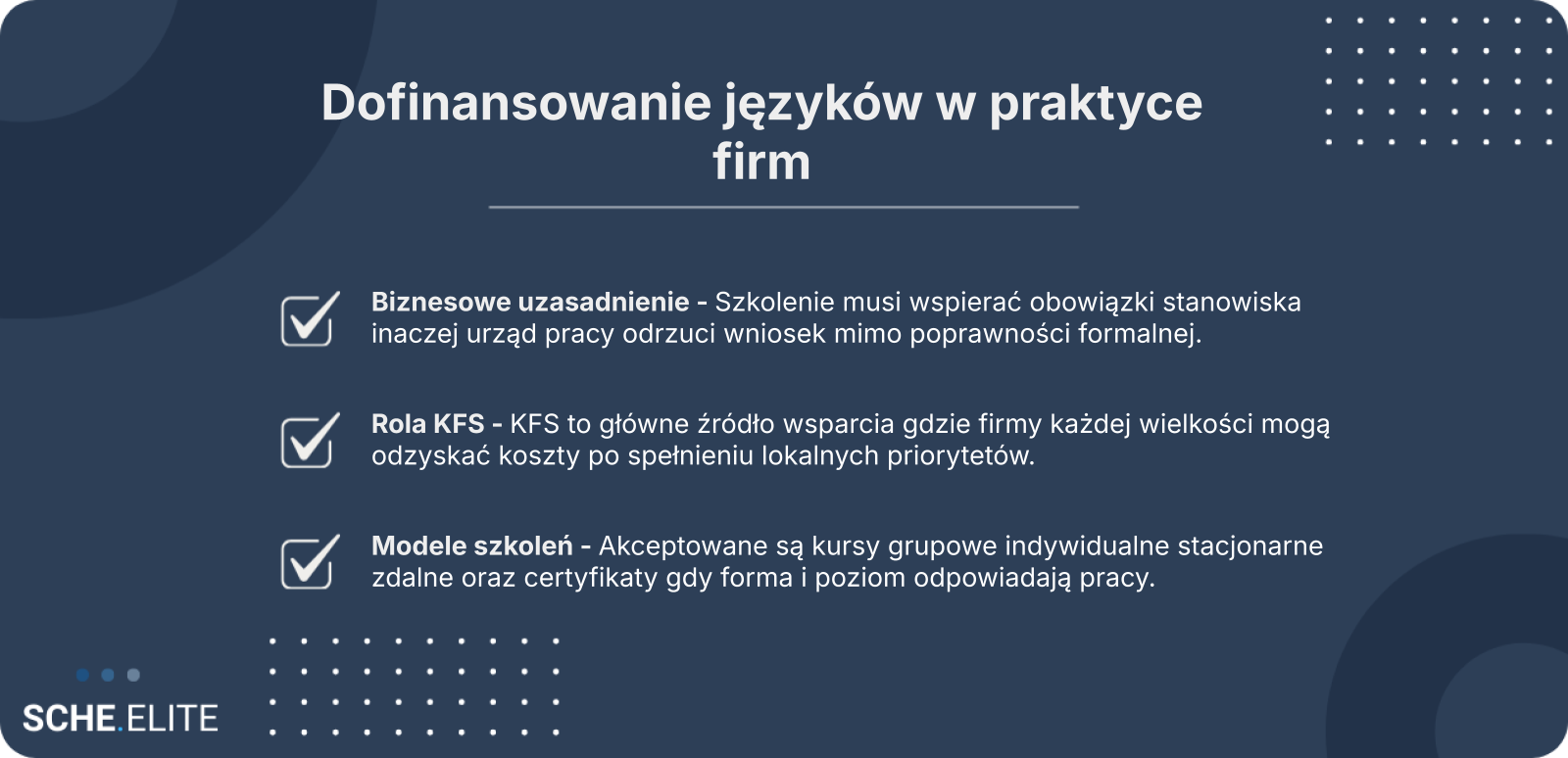 Mikro i małe firmy często traktowane są jako podmioty wymagające wsparcia stabilizacyjnego, co w praktyce może sprzyjać pozytywnej ocenie wniosków, jeśli szkolenie językowe jest powiązane z utrzymaniem kontraktów lub rozszerzeniem działalności. Z kolei większe organizacje muszą szczególnie precyzyjnie wykazać, dlaczego finansowanie publiczne jest uzasadnione w ich modelu biznesowym.