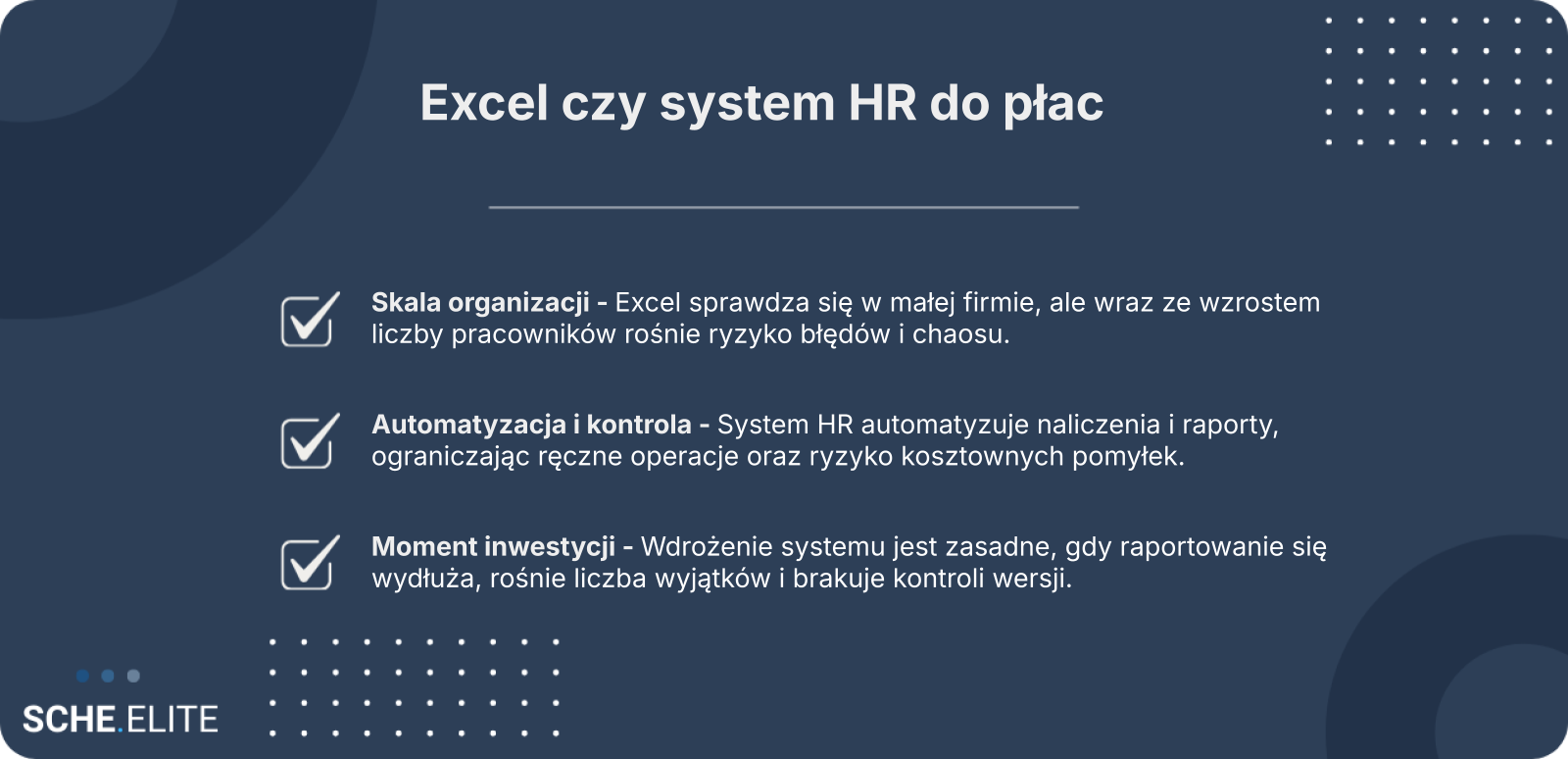 Wraz ze wzrostem skali organizacji rośnie liczba danych, zależności i wyjątków w obszarze wynagrodzeń. To moment, w którym porównanie Excel vs dedykowane systemy HR przestaje być kwestią wygody, a staje się elementem zarządzania ryzykiem i efektywnością. Dedykowane narzędzia nie eliminują potrzeby kontroli, ale porządkują procesy i ograniczają manualne interwencje.