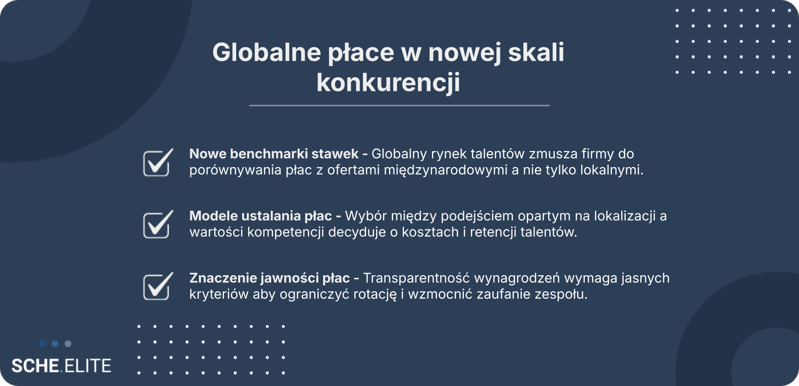 Jednocześnie w warunkach, jakie tworzy globalny rynek talentów, model ten może być postrzegany jako mniej atrakcyjny dla specjalistów posiadających kompetencje o międzynarodowym popycie. Jeżeli różnice między krajami są znaczne, najlepsi eksperci będą skłonni wybierać pracodawców oferujących stawki bliższe globalnym benchmarkom.