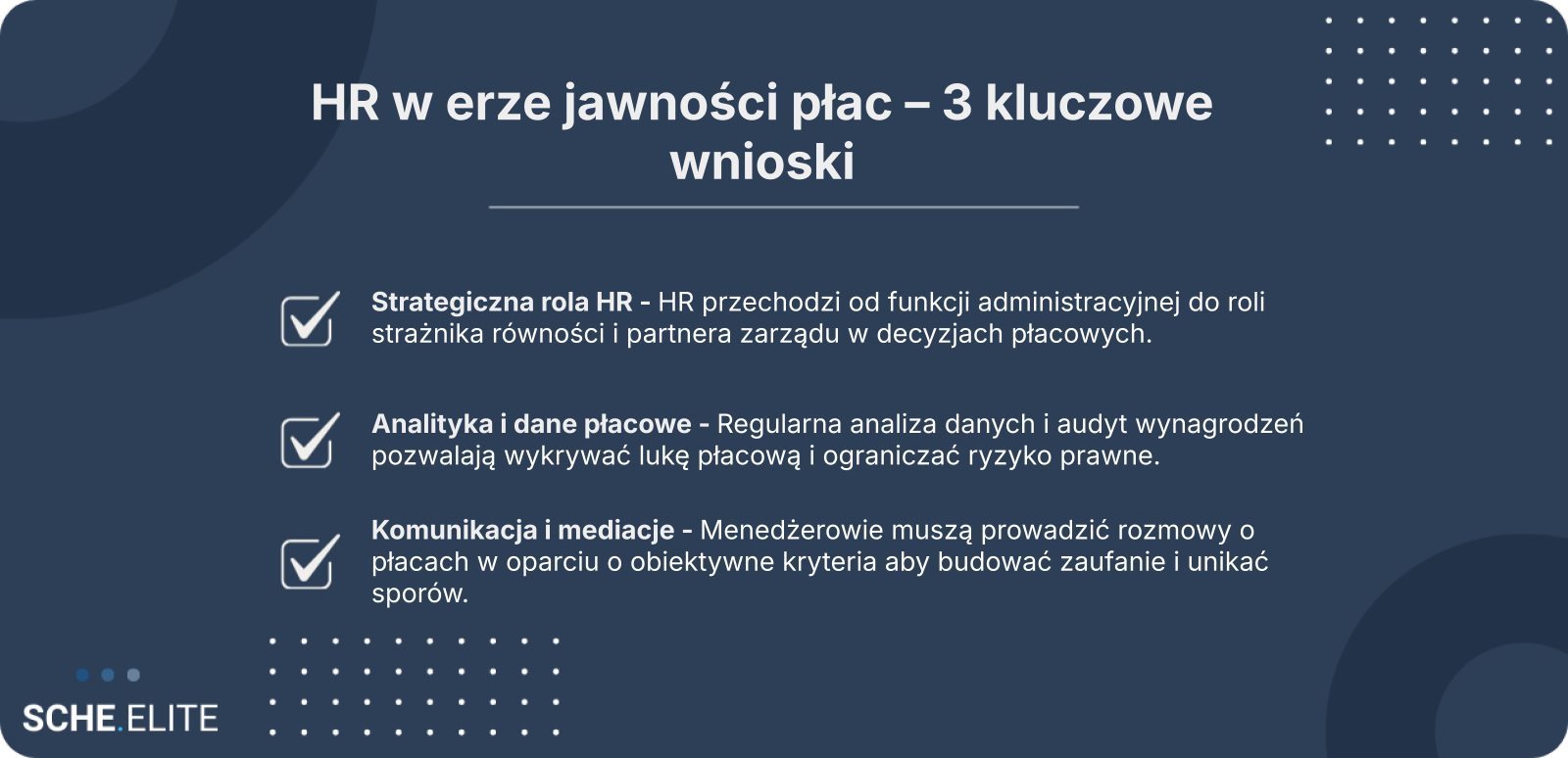 Oznacza to przejście od funkcji administracyjnej do roli strategicznego partnera zarządu i strażnika równości. HR odpowiada nie tylko za zgodność z wymogami raportowymi, ale także za spójność systemu wynagrodzeń i umiejętność uzasadniania decyzji płacowych na podstawie danych.