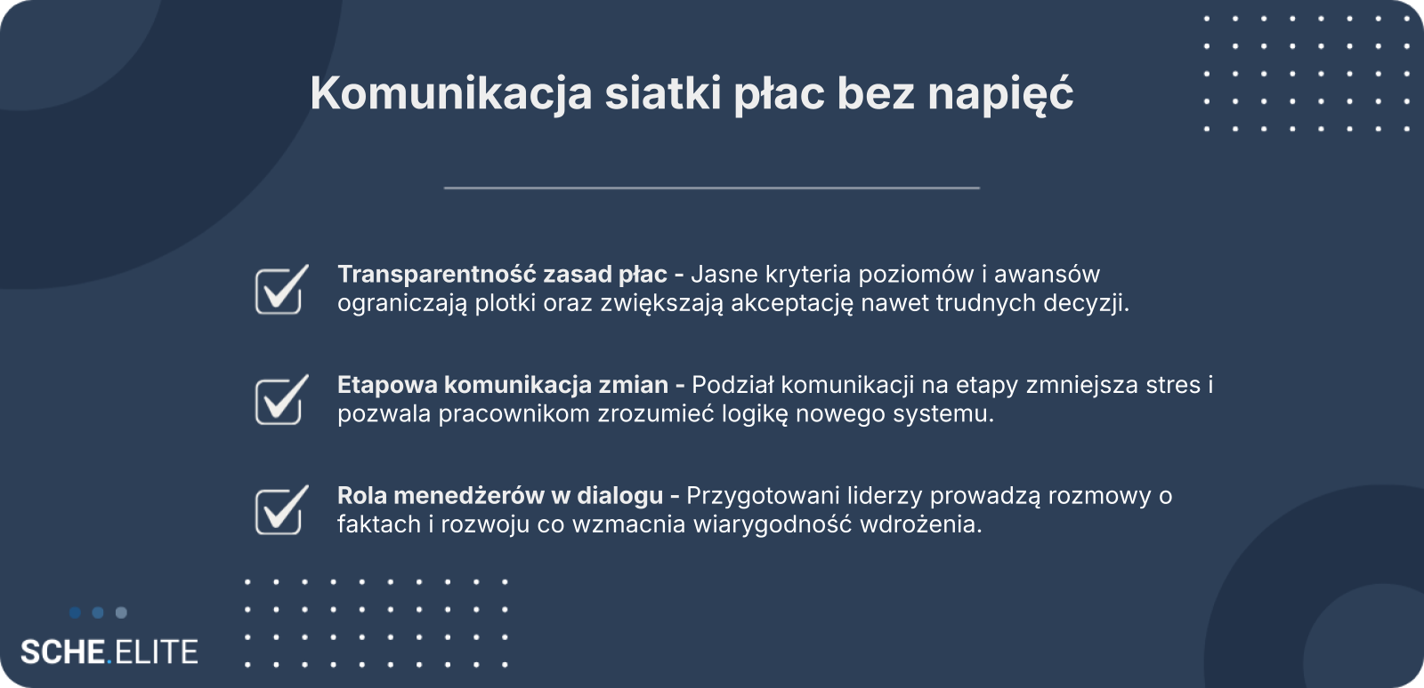 Tabela: Elementy siatki płac a zakres informacji przekazywanych pracownikomElement systemuCo komunikować pracownikom Takie uporządkowanie informacji pozwala oddzielić systemowe zasady od indywidualnych ocen. Pracownik widzi, że wynagrodzenie nie jest efektem uznaniowej decyzji, ale mieści się w określonych ramach. Jednocześnie warto podkreślić, że widełki płacowe dają przestrzeń rozwoju – przesunięcie w ich obrębie jest możliwe przy spełnieniu określonych warunków. Wdrożenie siatki płac zyskuje wiarygodność wtedy, gdy komunikat o logice widełek jest spójny w skali całej organizacji. Dlatego przed ogłoszeniem zasad warto przeprowadzić wewnętrzne warsztaty z menedżerami i upewnić się, że wszyscy rozumieją te same definicje i kryteria. Kiedy organizacja decyduje się na większą przejrzystość, pracownicy zaczynają analizować swoją sytuację w nowym kontekście. Porównują poziom stanowiska, zakres odpowiedzialności i potencjał rozwojowy. To naturalny proces, który nie powinien być traktowany jako zagrożenie. Transparentność wynagrodzeń wpływa na decyzje o pozostaniu w firmie, ubieganiu się o awans czy zmianie ścieżki kariery. Jeśli zasady są jasne, pracownik może świadomie zaplanować rozwój, wiedząc, jakie kompetencje zwiększą jego wartość w ramach systemu. Brak przejrzystości prowadzi natomiast do frustracji i domysłów. Warto wyraźnie oddzielić komunikację systemową od indywidualnych rozmów płacowych. System pokazuje ramy, natomiast konkretne decyzje wymagają osobnej, uważnej rozmowy. Takie rozróżnienie chroni organizację przed nieporozumieniami i pozwala utrzymać spójność przekazu. Komunikacja zmian płacowych powinna być zaplanowana w etapach, a nie ograniczona do jednego ogłoszenia. Na początku warto przedstawić cel projektu i ogólne założenia: dlaczego firma podejmuje to działanie oraz jakie wartości za nim stoją. To moment na zbudowanie kontekstu i podkreślenie, że celem jest uporządkowanie zasad. Kolejny etap to prezentacja struktury systemu – poziomów stanowisk, widełek oraz kluczowych kryteriów. Tutaj istotne jest zapewnienie przestrzeni na pytania oraz zebranie sygnałów zwrotnych. Transparentność wynagrodzeń wymaga dialogu, nie tylko jednostronnego komunikatu. Ostatnia faza dotyczy rozmów indywidualnych. To w ich trakcie pracownicy dowiadują się, gdzie znajdują się w strukturze i jakie mają perspektywy rozwoju. Menedżerowie powinni być wcześniej przygotowani do takich spotkań – wyposażeni w jasne argumenty i wiedzę o systemie. Odpowiadając na pytanie, jak komunikować wdrożenie siatki płac pracownikom, warto pamiętać o spójności przekazu na każdym z tych etapów. Niespójność między komunikatem ogólnym a rozmową indywidualną szybko podważa wiarygodność. Konsekwencja i dostępność do wyjaśnień budują poczucie bezpieczeństwa, które jest niezbędne w procesie zmiany. Nawet najlepiej zaprojektowane wdrożenie siatki płac nie przyniesie oczekiwanych efektów, jeśli organizacja nie przygotuje liderów do rozmów z zespołami. To menedżerowie są pierwszą linią kontaktu z pracownikami i od ich kompetencji komunikacyjnych zależy, czy transparentność wynagrodzeń zostanie odebrana jako realna zmiana, czy tylko formalność. Przygotowanie nie powinno ograniczać się do przekazania slajdów z nową strukturą wynagrodzeń. Obejmuje ono scenariusze trudnych pytań, trening rozmów o rozwoju oraz jasne ustalenie granic decyzyjnych. Jeśli zastanawiasz się, jak komunikować wdrożenie siatki płac pracownikom w sposób spójny w całej organizacji, zacznij właśnie od wzmocnienia liderów. Menedżer nie jest przekaźnikiem komunikatu z HR. Jest tłumaczem logiki systemu na realia zespołu. To on wyjaśnia, jak nowe widełki płacowe odnoszą się do zakresu odpowiedzialności, jak rozumieć poziomy stanowisk oraz jakie są kryteria awansu w praktyce. W rozmowach o zmianach można zauważyć dwa skrajne podejścia: W praktyce to drugie podejście buduje dojrzałość zespołu. Transparentność wynagrodzeń wymaga odwagi w przyznaniu, że system nie zadowoli wszystkich w takim samym stopniu. Rolą menedżera jest pokazanie, jakie są ramy decyzji oraz w jaki sposób pracownik może rozwijać się w ich obrębie. Dlatego przed startem komunikacji warto przeprowadzić warsztaty z liderami: przećwiczyć odpowiedzi na pytania o różnice płacowe, przygotować wspólne definicje poziomów stanowisk oraz ustalić, jakie informacje są jawne, a jakie pozostają poufne. Spójność przekazu w całej organizacji jest warunkiem powodzenia projektu. Spotkania indywidualne są momentem, w którym ogólne założenia systemu zderzają się z konkretną sytuacją pracownika. To tutaj pojawiają się pytania o miejsce w strukturze, tempo wzrostu wynagrodzenia czy możliwość przejścia na wyższy poziom. Jeżeli zastanawiasz się, jak komunikować wdrożenie siatki płac pracownikom w cztery oczy, kluczowe jest rozdzielenie dwóch wątków: zasad systemowych i decyzji indywidualnej. Najpierw wyjaśnij, jak działa struktura i jakie są jej cele. Dopiero potem odnieś się do sytuacji konkretnej osoby. W rozmowie warto: Unikaj porównań do innych osób w zespole. Transparentność wynagrodzeń nie oznacza ujawniania danych indywidualnych. Oznacza natomiast, że każdy rozumie zasady gry i wie, jakie są oczekiwania wobec danego poziomu stanowiska. Najtrudniejsze rozmowy często wynikają z rozbieżności między samooceną pracownika a oceną organizacji. Warto wtedy wrócić do ustalonych kryteriów i pokazać, jak zostały zastosowane w sposób spójny. Wdrożenie systemu wynagrodzeń dotyczy nie tylko pracowników liniowych. Równie ważne jest uwzględnienie perspektywy kadry kierowniczej, działu finansów oraz przedstawicieli pracowników. Każda z tych grup ma inne obawy i inne potrzeby informacyjne. Dla zarządu kluczowy będzie wpływ projekt