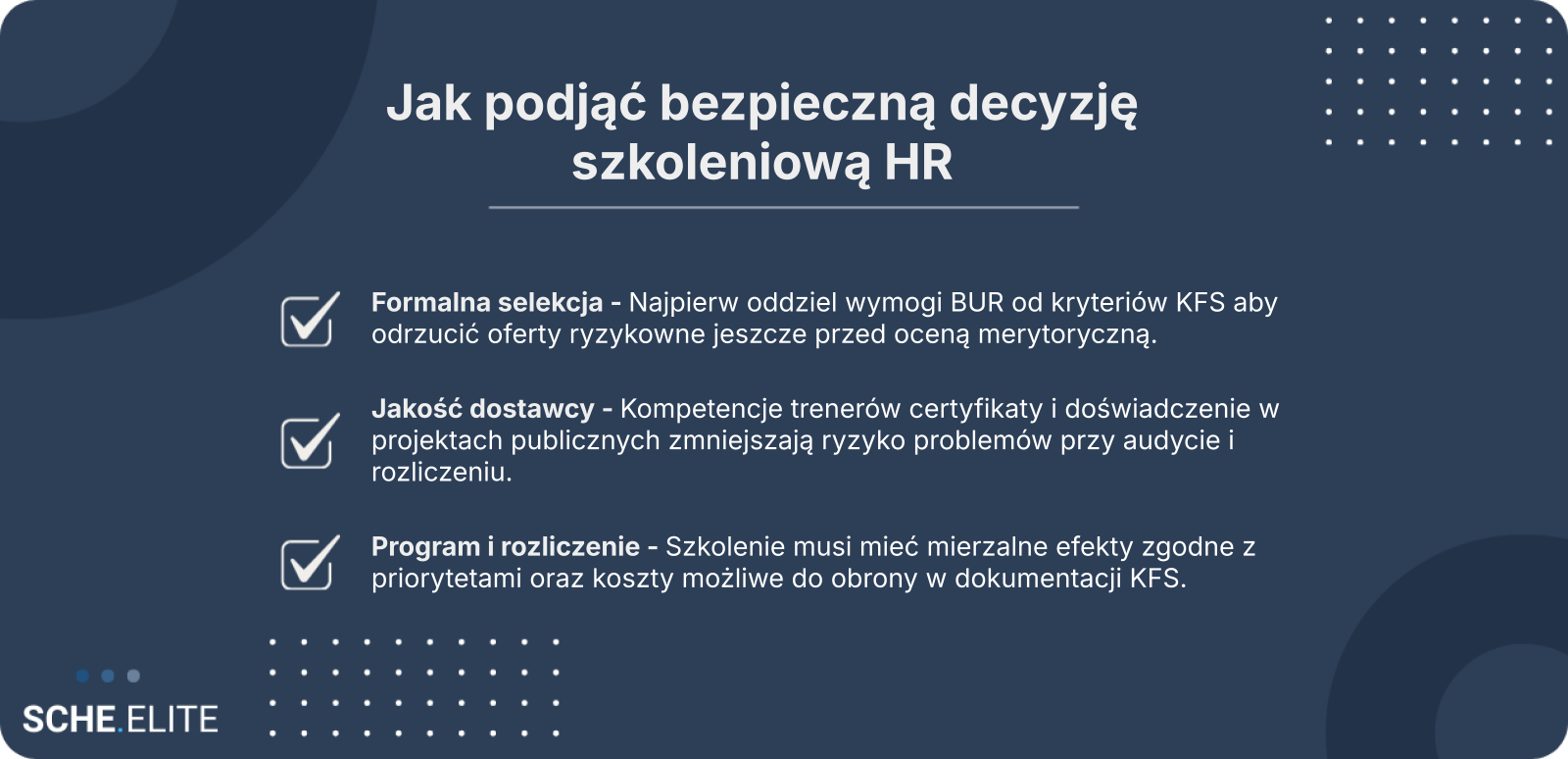 Świadome uwzględnienie wymagań KFS już na etapie shortlisty usług z BUR znacząco skraca proces i zmniejsza obciążenie decyzyjne HR.