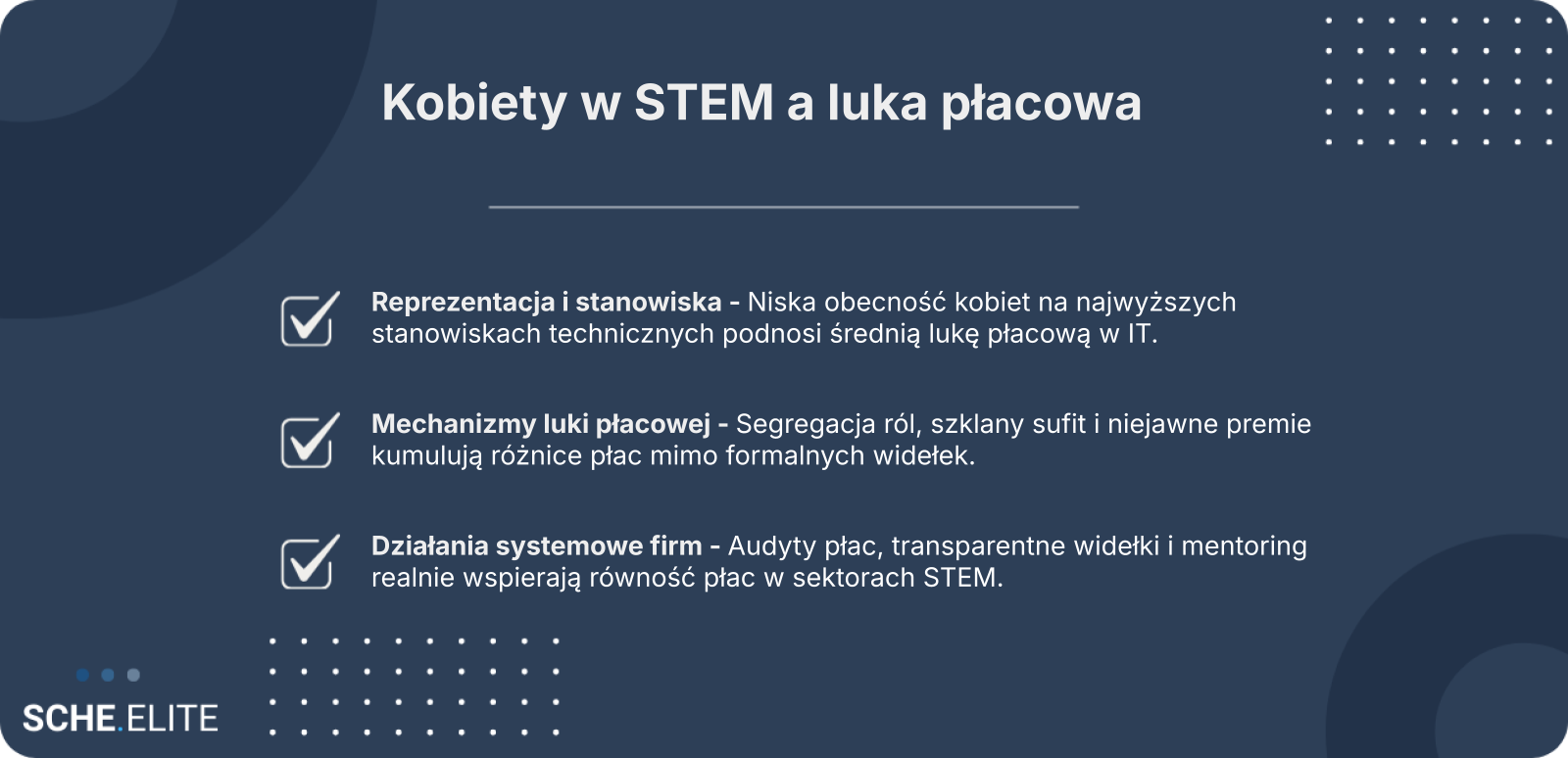 Tabela: Luka płacowa w wybranych sektorach w Polsce i EuropieSektor / krajSzacowana luka płacowa Interpretując te dane, należy zachować ostrożność. Część analiz uwzględnia wyłącznie wynagrodzenie zasadnicze, inne także premie projektowe i udziały w zyskach. W sektorze IT premie oraz bonusy stanowią istotną część całkowitego pakietu, co dodatkowo komplikuje porównania między branżami. Na tle Unii Europejskiej Polska wypada relatywnie korzystnie pod względem ogólnej luki płacowej, która jest niższa niż średnia unijna. Nie oznacza to jednak, że sytuacja kobiet w sektorach technicznych jest w pełni satysfakcjonująca. W wielu krajach Europy Zachodniej udział kobiet w zawodach ICT jest porównywalny lub wyższy, lecz jednocześnie różnice w dostępie do stanowisk kierowniczych pozostają znaczące. W krajach skandynawskich odsetek kobiet w STEM jest wspierany przez rozbudowane polityki równościowe, transparentność wynagrodzeń oraz kulturę organizacyjną sprzyjającą godzeniu życia zawodowego z prywatnym. W państwach Europy Środkowo-Wschodniej większym wyzwaniem jest wciąż stereotypowe postrzeganie ról zawodowych. Różnice międzynarodowe pokazują, że skala zjawiska nie jest niezmienna – zależy od regulacji prawnych, praktyk biznesowych oraz podejścia do równości płac. To ważna wskazówka dla firm planujących długofalowe strategie różnorodności. Różnice w wynagrodzeniach w sektorach technologicznych nie wynikają z jednego czynnika. To efekt nakładających się zjawisk: struktury zatrudnienia, modeli awansu, negocjacji płacowych oraz przerw w karierze. Analizując sytuację kobiet w STEM, warto spojrzeć na te elementy łącznie, ponieważ dopiero ich suma wyjaśnia, skąd bierze się utrzymująca się luka płacowa w IT i branżach pokrewnych. Z perspektywy organizacji kluczowe jest rozróżnienie między czynnikami systemowymi a indywidualnymi. Te pierwsze dotyczą sposobu projektowania ról, ocen pracowniczych i ścieżek awansu. Drugie związane są z decyzjami zawodowymi, stylem negocjacji czy dostępnością wzorców. Dopiero zrozumienie tej struktury pozwala skutecznie wspierać równość płac. Jednym z najważniejszych mechanizmów wpływających na wysokość wynagrodzeń jest segregacja stanowisk, czyli koncentracja kobiet i mężczyzn w różnych typach ról. W firmach technologicznych kobiety częściej obejmują stanowiska związane z koordynacją, wsparciem procesów lub analizą, podczas gdy mężczyźni dominują w obszarach bezpośrednio powiązanych z tworzeniem kluczowych rozwiązań technologicznych. Różnice te mają znaczenie finansowe, ponieważ role postrzegane jako „rdzeniowe” dla produktu są zwykle wyceniane wyżej. Nawet jeśli formalnie firma deklaruje równość płac, koncentracja kobiet w mniej premiowanych segmentach organizacji prowadzi do utrwalania różnic w średnich wynagrodzeniach. Dodatkowo nazewnictwo stanowisk oraz kryteria oceny efektywności bywają projektowane w sposób faworyzujący określony styl pracy. Jeśli premiowane są głównie indywidualne osiągnięcia techniczne, a mniej współpraca czy zarządzanie interesariuszami, wpływa to na końcowy poziom wynagrodzeń i ogranicza realną równość płac. Kluczowym elementem wyjaśniającym nierówności finansowe jest tzw. efekt „szklanego sufitu”. Kobiety w STEM są relatywnie licznie reprezentowane na poziomie specjalistycznym, lecz ich udział maleje wraz z kolejnymi szczeblami zarządzania. Im wyższe stanowisko, tym większa dysproporcja. Ponieważ najwyższe poziomy organizacji wiążą się z najwyższymi pakietami wynagrodzeń, premiami i udziałami w zyskach, ograniczony dostęp kobiet do tych ról automatycznie zwiększa średnią różnicę płac. Luka płacowa w IT często nie wynika wyłącznie z różnic w stawkach na identycznych stanowiskach, lecz z nierównej struktury awansów. Znaczenie mają również nieformalne sieci wsparcia i rekomendacje do projektów o wysokiej widoczności. Projekty strategiczne częściej prowadzą do awansu i podwyżek, dlatego brak równego dostępu do nich przekłada się na długofalowe różnice w wynagrodzeniach. Firmy, które nie monitorują danych o awansach według płci, mogą nie zauważać narastającej dysproporcji. W efekcie nawet przy formalnie spójnych widełkach płacowych średnie zarobki kobiet i mężczyzn zaczynają się rozchodzić. Dopiero analiza ścieżek kariery w ujęciu kilkuletnim pokazuje pełen obraz mechanizmów, które wpływają na poziom wynagrodzeń w sektorze technologicznym. Oprócz czynników strukturalnych znaczenie mają także uwarunkowania kulturowe i społeczne. Do najczęściej wskazywanych barier należą: Stereotypy mogą wpływać zarówno na samoocenę kandydatek, jak i na decyzje rekrutacyjne czy awansowe podejmowane nieświadomie przez menedżerów. Z kolei przerwy w karierze często skutkują wolniejszym tempem wzrostu wynagrodzenia, szczególnie w dynamicznym środowisku technologicznym. Różnice w negocjacjach nie oznaczają braku kompetencji, lecz odmienne strategie komunikacyjne. Jeśli organizacja nie stosuje jasnych kryteriów podwyżek, wynagrodzenia częściej odzwierciedlają indywidualną asertywność niż rzeczywistą wartość pracy. To pokazuje, że równość płac wymaga nie tylko deklaracji, ale i konkretnych rozwiązań systemowych. Dyskusja o nierównościach wynagrodzeń w sektorach technicznych coraz częściej przesuwa się z poziomu diagnozy na poziom konkretnych działań. Firmy, które zatrudniają Kobiety w STEM, stają dziś przed wyzwaniem systemowego uporządkowania polityki płacowej, ścieżek awansu i zasad oceny pracy. Sama deklaracja wsparcia różnorodności nie wystarcza, jeśli nie przekłada się na mierzalne wskaźniki oraz transparentne procedury. Zmniejszenie zjawiska, jakim jest luka płacowa w IT i pokrewnych branżach, wymaga połączenia narzędzi analitycznych, działa