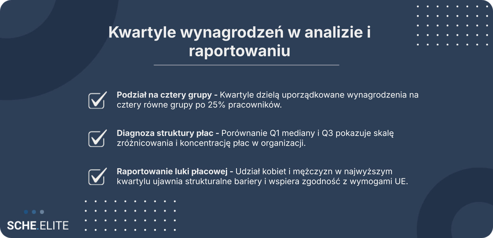 W kontekście unijnych regulacji dotyczących przejrzystości płac kwartyle stają się elementem formalnego raportowania. Organizacje muszą prezentować dane o udziale płci w poszczególnych kwartylach oraz zapewnić spójną metodologię obliczeń. Oznacza to konieczność regularnego monitorowania struktury wynagrodzeń i dokumentowania przyjętych zasad analizy.