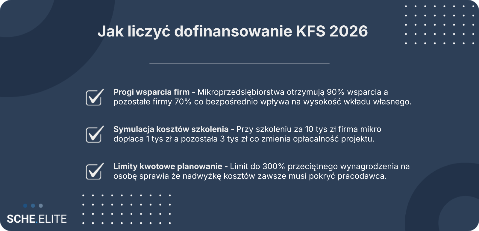 Jeżeli koszt szkolenia przekracza ten próg, nadwyżka zawsze obciąża pracodawcę, niezależnie od wielkości firmy. To częsty punkt nieuwagi przy planowaniu droższych programów rozwojowych, takich jak długie cykle szkoleń lub zaawansowane kursy techniczne. Dofinansowanie KFS 2026 działa więc w dwóch wymiarach jednocześnie: procentowym oraz kwotowym.