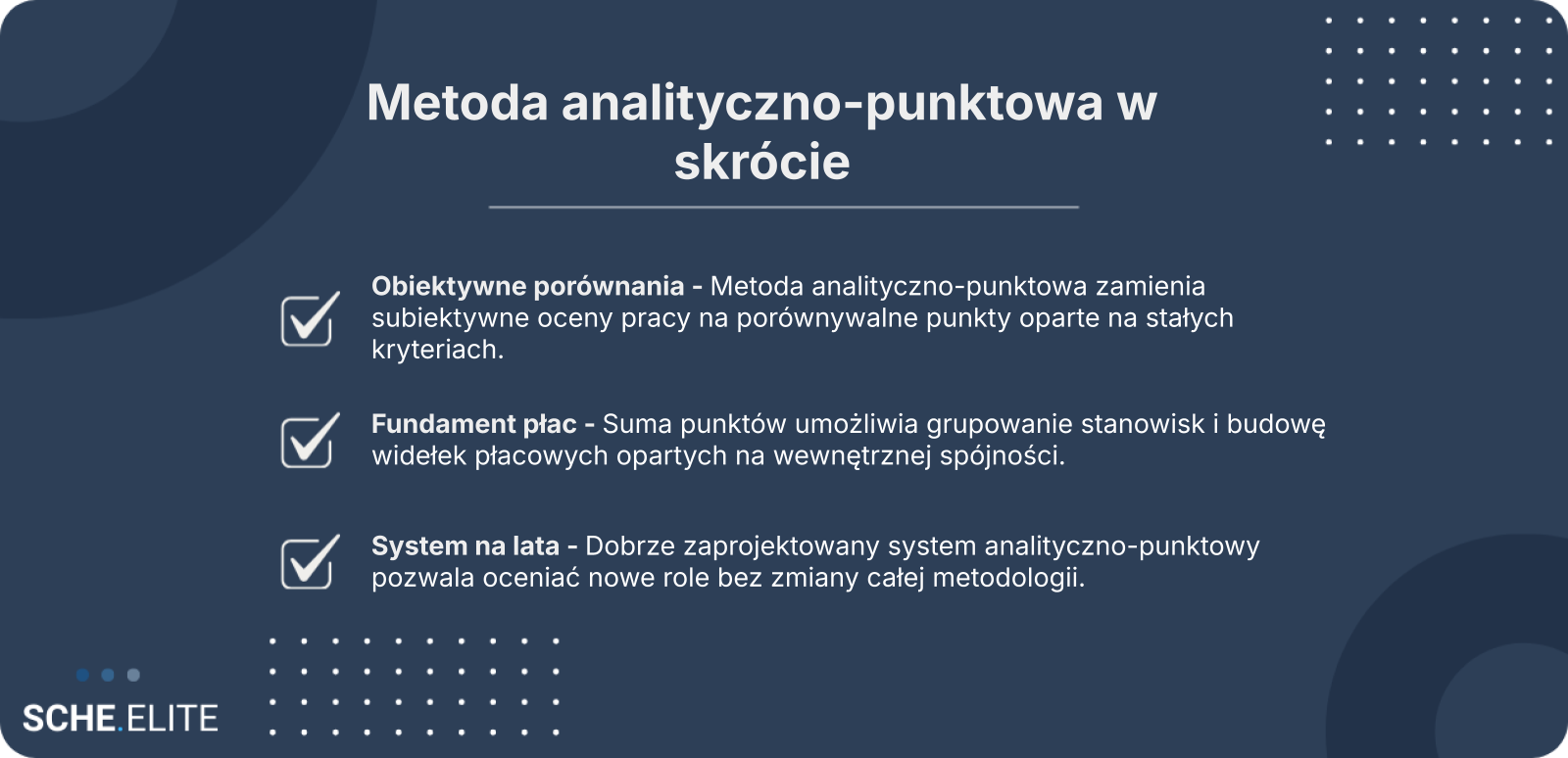 Istotą podejścia jest analityczne rozbicie stanowiska na elementy składowe oraz przypisanie im punktowej wartości zgodnie z wcześniej ustaloną skalą. Kluczowa rola metody polega na zamianie subiektywnych ocen na porównywalne punkty. To właśnie ta cecha odróżnia ją od ocen intuicyjnych i sprawia, że jest tak ceniona w organizacjach, które chcą wprowadzić transparentność.