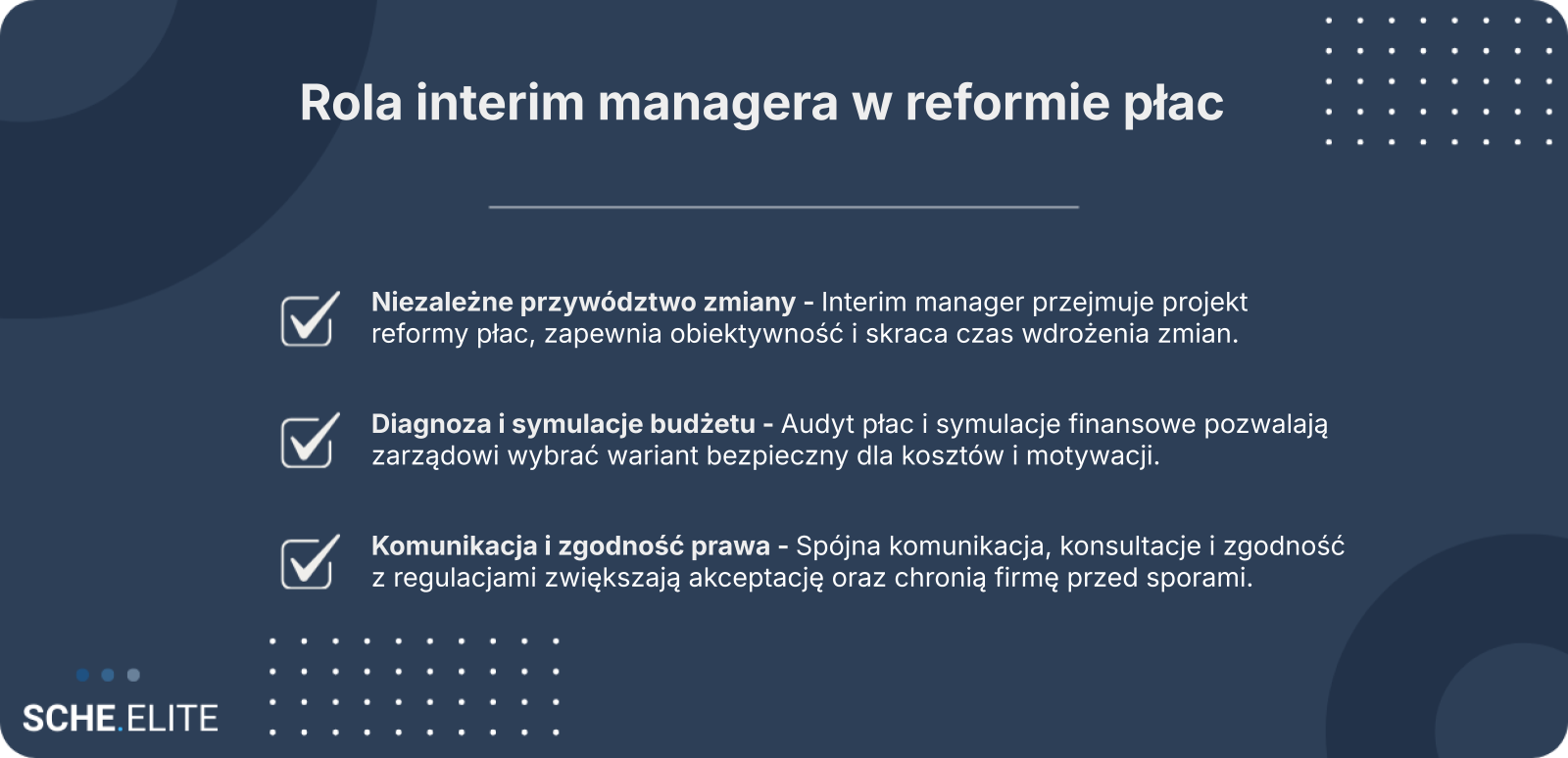 Rola Interim Managera w procesie przebudowy systemu płac polega na oddzieleniu warstwy emocjonalnej od merytorycznej. Ekspert przygotowuje argumentację opartą na danych rynkowych, analizach benchmarkowych i symulacjach finansowych. Jednocześnie wspiera zarząd w określeniu granic negocjacyjnych, tak aby projekt nie utracił spójności ekonomicznej.