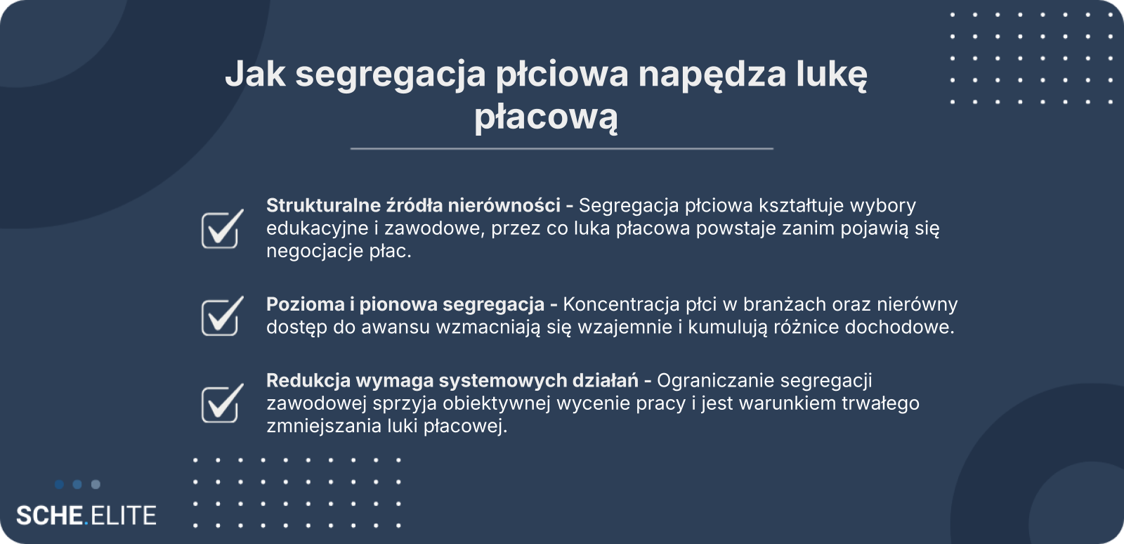 Segregacja zawodowa powoduje koncentrację kobiet i mężczyzn w sektorach o różnych stawkach rynkowych. Zawody sfeminizowane są często gorzej wyceniane, niezależnie od wymaganych kwalifikacji. W efekcie różnice płacowe powstają już na etapie wyboru ścieżki zawodowej.