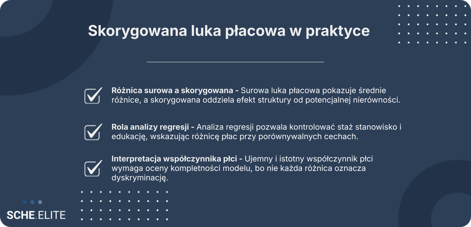 Analiza regresji pozwala jednocześnie uwzględnić wiele czynników wpływających na płace, takich jak staż, dział czy poziom stanowiska. Współczynnik przy zmiennej płci pokazuje różnicę wynagrodzenia przy założeniu, że pozostałe zmienne są stałe. To właśnie ta wartość stanowi przybliżenie skorygowanej luki płacowej.