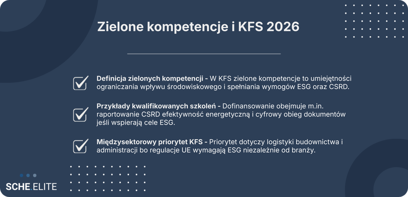 W tym kontekście coraz częściej pojawiają się pytania o zielone kompetencje oraz szkolenia, które można objąć wsparciem publicznym. Krajowy Fundusz Szkoleniowy staje się jednym z kluczowych narzędzi umożliwiających finansowanie rozwoju kompetencji związanych z ESG, bez konieczności ponoszenia pełnych kosztów przez pracodawcę. Artykuł wyjaśnia, jak interpretować zielone kompetencje w ramach KFS, jakie szkolenia mogą kwalifikować się do wsparcia oraz dlaczego szkolenia ESG dofinansowanie i KFS 2026 dofinansowanie są istotne dla szerokiego grona firm.
