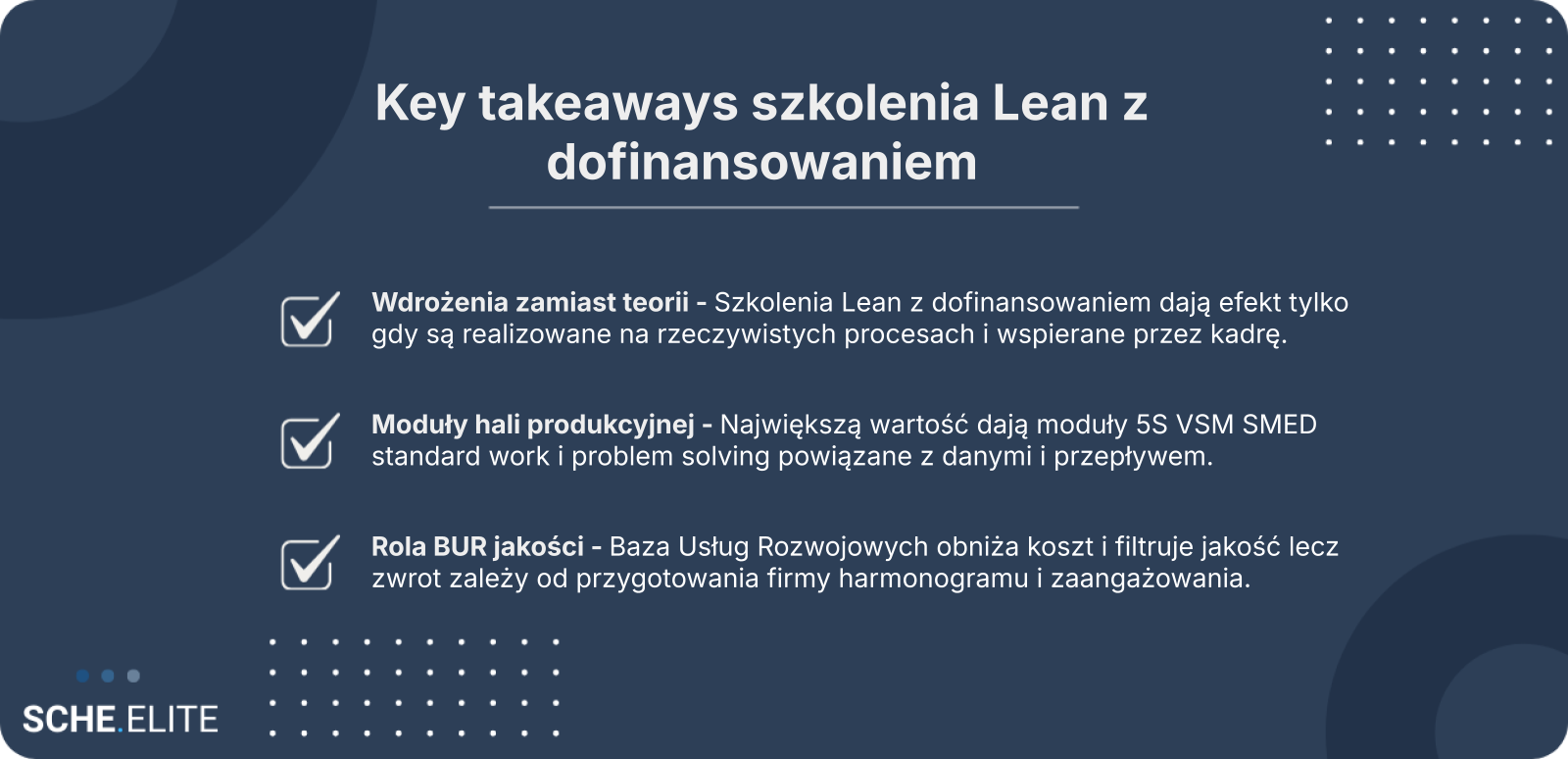 W kontekście decyzyjnym istotne jest to, że Lean nie obiecuje spektakularnych efektów bez pracy u podstaw. Efekty pojawiają się tam, gdzie uczestnicy szkolenia testują rozwiązania w rzeczywistych procesach, mierzą wyniki i korygują standardy. To właśnie ta systematyczność, wsparta dofinansowaniem, sprawia, że inwestycja ma sens biznesowy.
