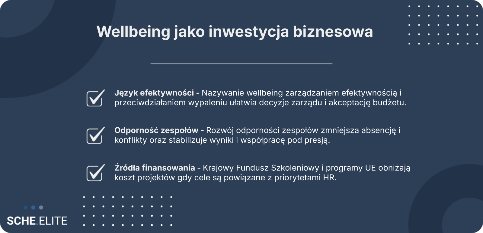 Najskuteczniejsze jest odwołanie się do ryzyk biznesowych, takich jak spadek produktywności, błędy operacyjne i rotacja. Wellbeing warto przedstawić jako element zarządzania efektywnością osobistą i ciągłością działania zespołów. Dofinansowanie dodatkowo wzmacnia argument finansowy.