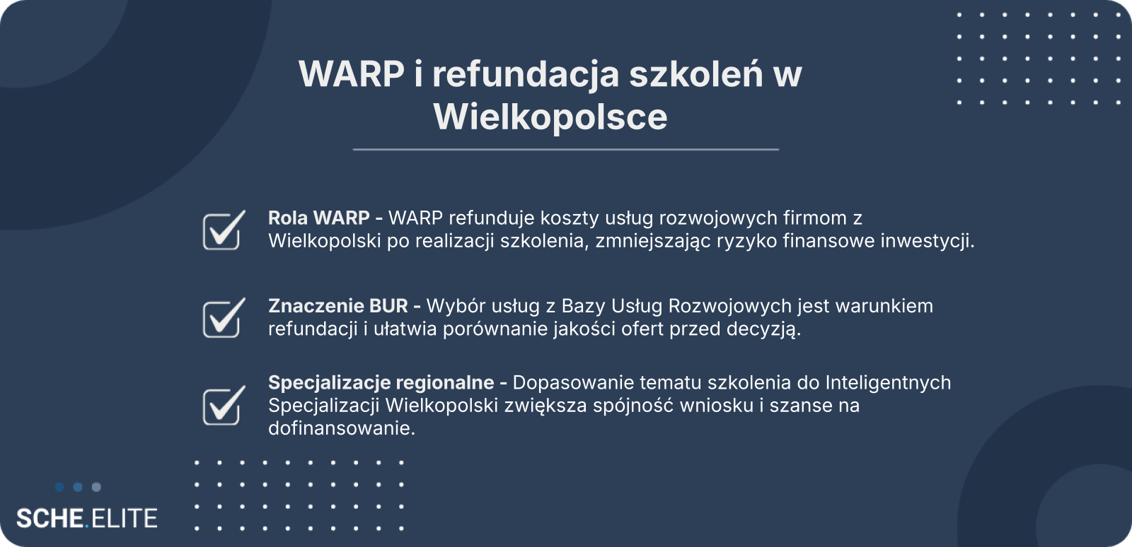 Centralnym elementem systemu jest refundacja kosztów poniesionych na usługi rozwojowe wybrane w Baza Usług Rozwojowych. Przedsiębiorca sam decyduje o tematyce, terminie i formie szkolenia, a następnie, po jego realizacji, ubiega się o zwrot części poniesionych wydatków. W tym procesie istotne znaczenie ma także zgodność działań z Inteligentne Specjalizacje Wielkopolski, które wpływają na ocenę merytoryczną planowanych inwestycji.