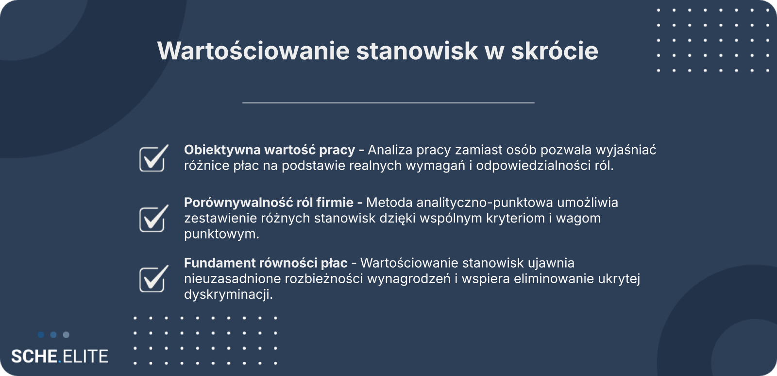 Metoda analityczno-punktowa rozbija pracę na zestaw wspólnych kryteriów, takich jak kompetencje, odpowiedzialność czy warunki pracy. Każde kryterium ma przypisaną skalę punktową i wagę, co umożliwia obiektywne porównanie różnych ról. Suma punktów pokazuje relacje pomiędzy stanowiskami.