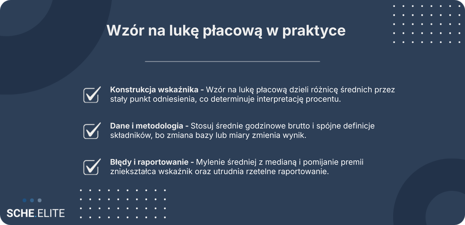 Licznik pokazuje bezwzględną różnicę między dwiema średnimi. Mianownik określa punkt odniesienia i nadaje wynikowi charakter procentowy. Każdy element równania ma precyzyjną definicję statystyczną, obejmującą określony zakres podmiotów i składników płacy.